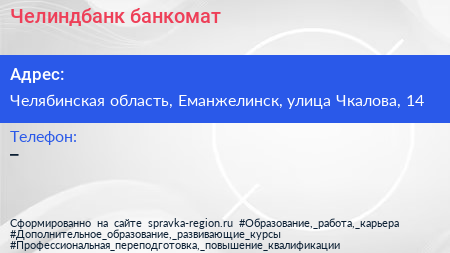 Челиндбанк, банкомат по адресу Челябинская область, Еманжелинск, улица Чкалова, 14 в дальнейшем Организация, размещена в следующих категориях:
