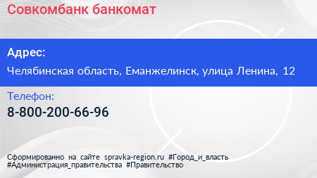 Совкомбанк, банкомат по адресу Челябинская область, Еманжелинск, улица Ленина, 12 в дальнейшем Организация, размещена в следующих категориях: