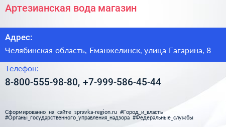 Артезианская вода, магазин по адресу Челябинская область, Еманжелинск, улица Гагарина, 8 в дальнейшем Организация, размещена в следующих категориях: