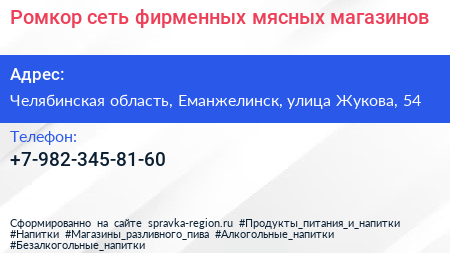 Ромкор, сеть фирменных мясных магазинов по адресу Челябинская область, Еманжелинск, улица Жукова, 54 в дальнейшем Организация, размещена в следующих категориях:
