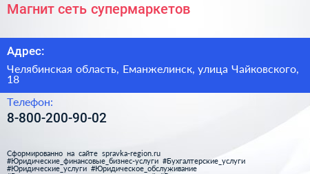 Магнит, сеть супермаркетов по адресу Челябинская область, Еманжелинск, улица Чайковского, 18 в дальнейшем Организация, размещена в следующих категориях: