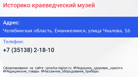 Историко-краеведческий музей по адресу Челябинская область, Еманжелинск, улица Чкалова, 16 в дальнейшем Организация, размещена в следующих категориях: