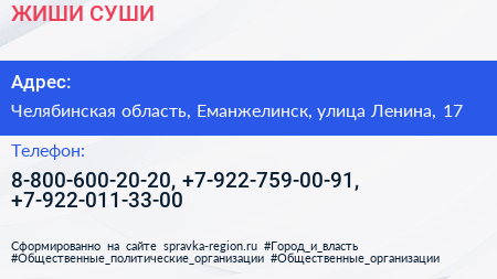 ЖИШИ СУШИ по адресу Челябинская область, Еманжелинск, улица Ленина, 17 в дальнейшем Организация, размещена в следующих категориях:
