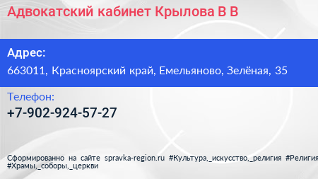 Адвокатский кабинет Крылова В.В. по адресу 663011, Красноярский край, Емельяново, Зелёная, 35 в дальнейшем Организация, размещена в следующих категориях: