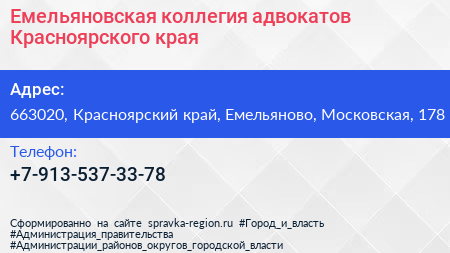 Емельяновская, коллегия адвокатов Красноярского края по адресу 663020, Красноярский край, Емельяново, Московская, 178 в дальнейшем Организация, размещена в следующих категориях: