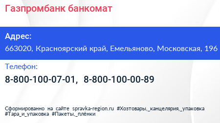 Газпромбанк, банкомат по адресу 663020, Красноярский край, Емельяново, Московская, 196 в дальнейшем Организация, размещена в следующих категориях: