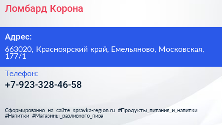 Ломбард Корона по адресу 663020, Красноярский край, Емельяново, Московская, 177/1 в дальнейшем Организация, размещена в следующих категориях: