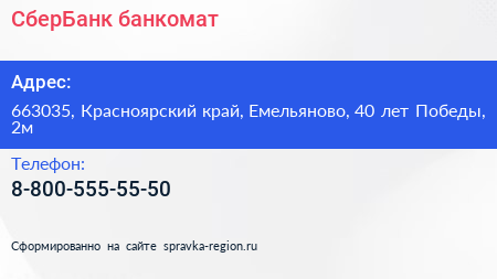 СберБанк, банкомат по адресу 663035, Красноярский край, Емельяново, 40 лет Победы, 2м в дальнейшем Организация, размещена в следующих категориях: