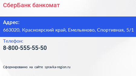 СберБанк, банкомат по адресу 663020, Красноярский край, Емельяново, Спортивная, 5/1 в дальнейшем Организация, размещена в следующих категориях: