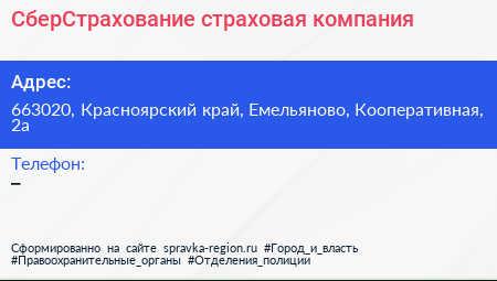 СберСтрахование, страховая компания по адресу 663020, Красноярский край, Емельяново, Кооперативная, 2а в дальнейшем Организация, размещена в следующих категориях: