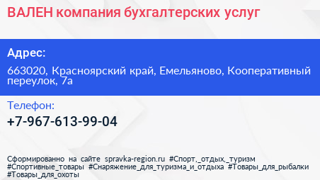 ВАЛЕН, компания бухгалтерских услуг по адресу 663020, Красноярский край, Емельяново, Кооперативный переулок, 7а в дальнейшем Организация, размещена в следующих категориях: