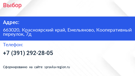 Выбор по адресу 663020, Красноярский край, Емельяново, Кооперативный переулок, 7д в дальнейшем Организация, размещена в следующих категориях:
