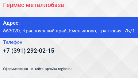 Гермес, металлобаза по адресу 663020, Красноярский край, Емельяново, Трактовая, 7Б/1 в дальнейшем Организация, размещена в следующих категориях: