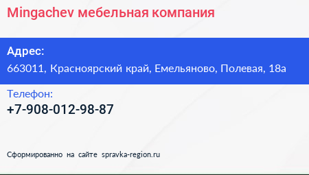 Mingachev, мебельная компания по адресу 663011, Красноярский край, Емельяново, Полевая, 18а в дальнейшем Организация, размещена в следующих категориях:
