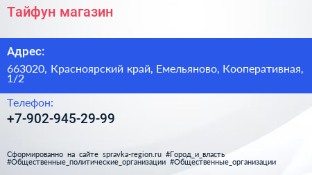 Тайфун, магазин по адресу 663020, Красноярский край, Емельяново, Кооперативная, 1/2 в дальнейшем Организация, размещена в следующих категориях:
