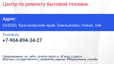 Центр по ремонту бытовой техники по адресу 663020, Красноярский край, Емельяново, Новая, 14е в дальнейшем Организация, размещена в следующих категориях:
