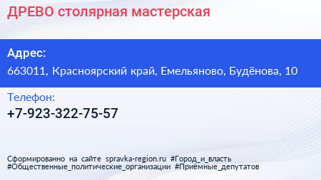 ДРЕВО, столярная мастерская по адресу 663011, Красноярский край, Емельяново, Будёнова, 10 в дальнейшем Организация, размещена в следующих категориях: