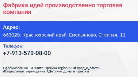 Фабрика идей, производственно-торговая компания по адресу 663020, Красноярский край, Емельяново, Степная, 11 в дальнейшем Организация, размещена в следующих категориях: