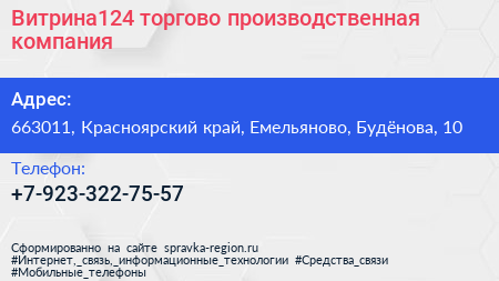 Витрина124, торгово-производственная компания по адресу 663011, Красноярский край, Емельяново, Будёнова, 10 в дальнейшем Организация, размещена в следующих категориях: