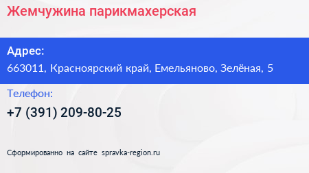 Жемчужина, парикмахерская по адресу 663011, Красноярский край, Емельяново, Зелёная, 5 в дальнейшем Организация, размещена в следующих категориях: