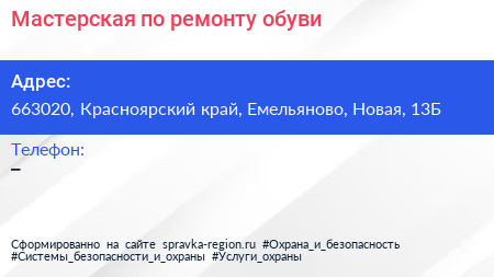 Мастерская по ремонту обуви по адресу 663020, Красноярский край, Емельяново, Новая, 13Б в дальнейшем Организация, размещена в следующих категориях:
