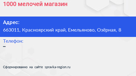 1000 мелочей, магазин по адресу 663011, Красноярский край, Емельяново, Озёрная, 8 в дальнейшем Организация, размещена в следующих категориях: