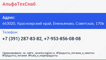 АльфаТехСнаб по адресу 663020, Красноярский край, Емельяново, Советская, 170в в дальнейшем Организация, размещена в следующих категориях: