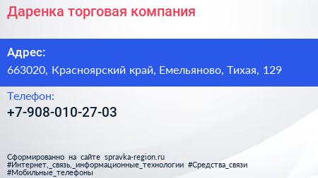 Даренка, торговая компания по адресу 663020, Красноярский край, Емельяново, Тихая, 129 в дальнейшем Организация, размещена в следующих категориях: