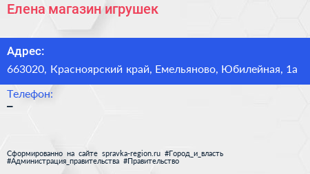 Елена, магазин игрушек по адресу 663020, Красноярский край, Емельяново, Юбилейная, 1а в дальнейшем Организация, размещена в следующих категориях: