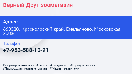 Верный Друг, зоомагазин по адресу 663020, Красноярский край, Емельяново, Московская, 200ж в дальнейшем Организация, размещена в следующих категориях: