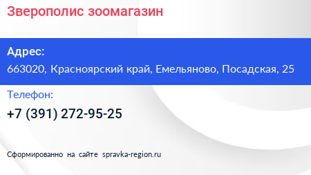 Зверополис, зоомагазин по адресу 663020, Красноярский край, Емельяново, Посадская, 25 в дальнейшем Организация, размещена в следующих категориях: