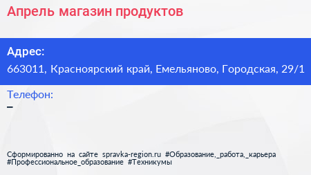 Апрель, магазин продуктов по адресу 663011, Красноярский край, Емельяново, Городская, 29/1 в дальнейшем Организация, размещена в следующих категориях: