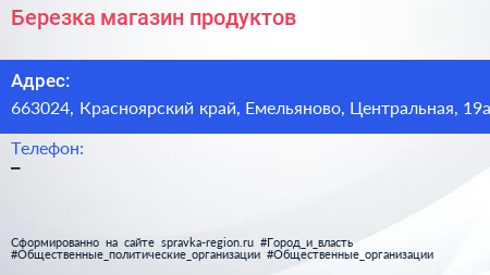 Березка, магазин продуктов по адресу 663024, Красноярский край, Емельяново, Центральная, 19а в дальнейшем Организация, размещена в следующих категориях: