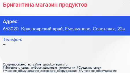 Бригантина, магазин продуктов по адресу 663020, Красноярский край, Емельяново, Советская, 22а в дальнейшем Организация, размещена в следующих категориях: