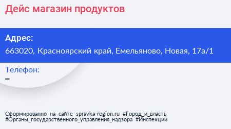 Дейс, магазин продуктов по адресу 663020, Красноярский край, Емельяново, Новая, 17а/1 в дальнейшем Организация, размещена в следующих категориях: