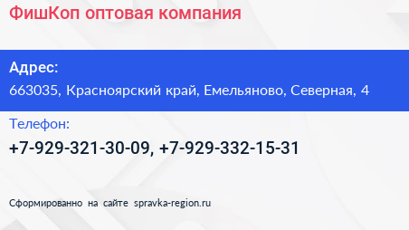 ФишКоп, оптовая компания по адресу 663035, Красноярский край, Емельяново, Северная, 4 в дальнейшем Организация, размещена в следующих категориях:
