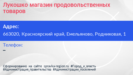 Лукошко, магазин продовольственных товаров по адресу 663020, Красноярский край, Емельяново, Родниковая, 1 в дальнейшем Организация, размещена в следующих категориях: