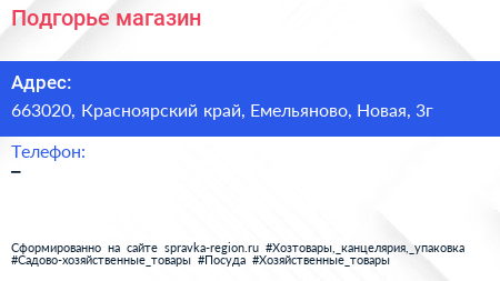 Подгорье, магазин по адресу 663020, Красноярский край, Емельяново, Новая, 3г в дальнейшем Организация, размещена в следующих категориях:
