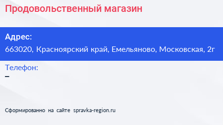 Продовольственный магазин по адресу 663020, Красноярский край, Емельяново, Московская, 2г в дальнейшем Организация, размещена в следующих категориях: