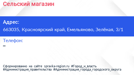 Сельский, магазин по адресу 663035, Красноярский край, Емельяново, Зелёная, 3/1 в дальнейшем Организация, размещена в следующих категориях: