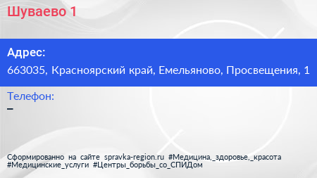 Шуваево-1 по адресу 663035, Красноярский край, Емельяново, Просвещения, 1 в дальнейшем Организация, размещена в следующих категориях: