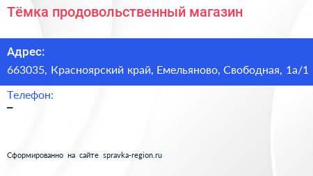 Тёмка, продовольственный магазин по адресу 663035, Красноярский край, Емельяново, Свободная, 1а/1 в дальнейшем Организация, размещена в следующих категориях: