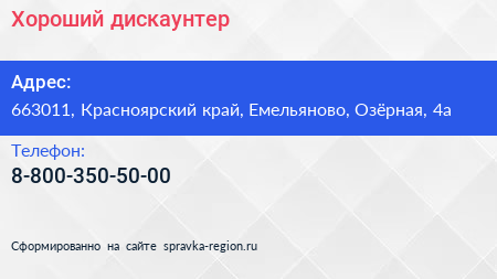 Хороший, дискаунтер по адресу 663011, Красноярский край, Емельяново, Озёрная, 4а в дальнейшем Организация, размещена в следующих категориях: