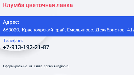 Клумба, цветочная лавка по адресу 663020, Красноярский край, Емельяново, Декабристов, 41а в дальнейшем Организация, размещена в следующих категориях: