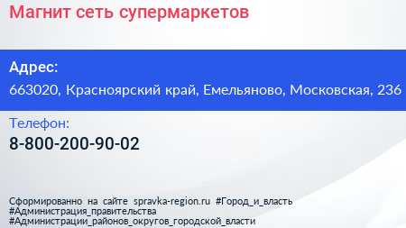 Магнит, сеть супермаркетов по адресу 663020, Красноярский край, Емельяново, Московская, 236 в дальнейшем Организация, размещена в следующих категориях: