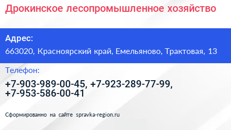 Дрокинское лесопромышленное хозяйство по адресу 663020, Красноярский край, Емельяново, Трактовая, 13 в дальнейшем Организация, размещена в следующих категориях: