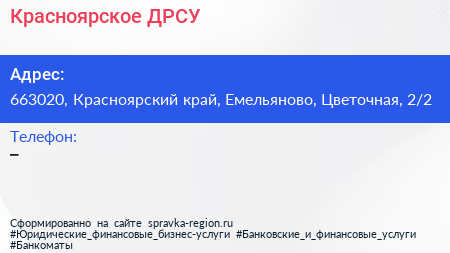 Красноярское ДРСУ по адресу 663020, Красноярский край, Емельяново, Цветочная, 2/2 в дальнейшем Организация, размещена в следующих категориях: