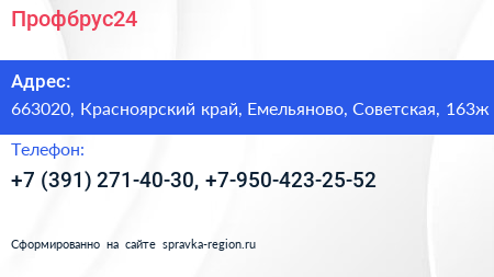 Профбрус24 по адресу 663020, Красноярский край, Емельяново, Советская, 163ж в дальнейшем Организация, размещена в следующих категориях: