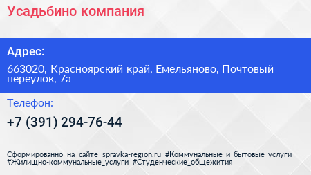 Усадьбино, компания по адресу 663020, Красноярский край, Емельяново, Почтовый переулок, 7а в дальнейшем Организация, размещена в следующих категориях: