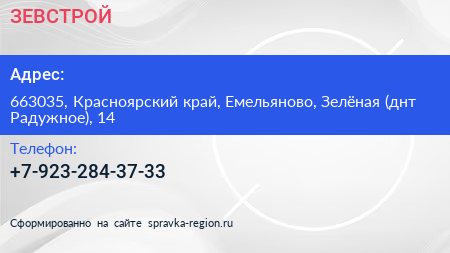 ЗЕВСТРОЙ по адресу 663035, Красноярский край, Емельяново, Зелёная (днт Радужное), 14 в дальнейшем Организация, размещена в следующих категориях: